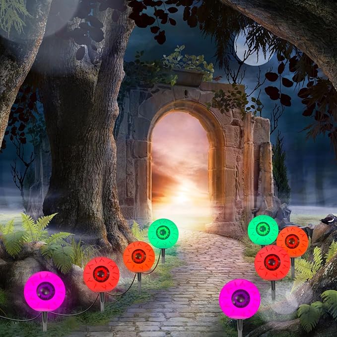 - Halloween Eyeballs Pathway Lights Outdoor: 7 Ft Halloween decorations pathway markers lights with 4 multicolor eyeball lights and 4 stakes, 24 inch lead with male plug, 12 inch spacing between eyeballs lights, 6 inch tail with female connector, total length 7 feet. halloween lawn decorations lights creating a perfectly frightening ambiance in your outdoor sidewalks spaces