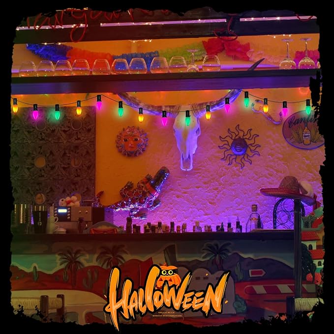 - Versatile Application: C7 led orange purple and green halloween decorations lights glow a warm white lights, vintage Christmas light string is dimmable, Ideal for decorating stores, restaurants, or any business looking to celebrate Halloween, such as the bedroom, bar, window, Christmas tree, thankgiving party, wedding, window, holidays, festivals, shows, restaurants, hotels, shopping centers, patio, or porch, pathway, roofline decorations and lightings