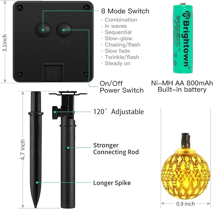 - 【Solar Powered & Auto On/Off】36ft 60 LED string lights, solar energy supply, adjustable monocrystalline silicon solar panel with better conversion rate of energy, no need to replace the battery or extra utility electric cost; Light sensor controls the solar globe lights auto on at dark and auto off at daytime.