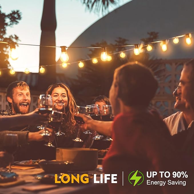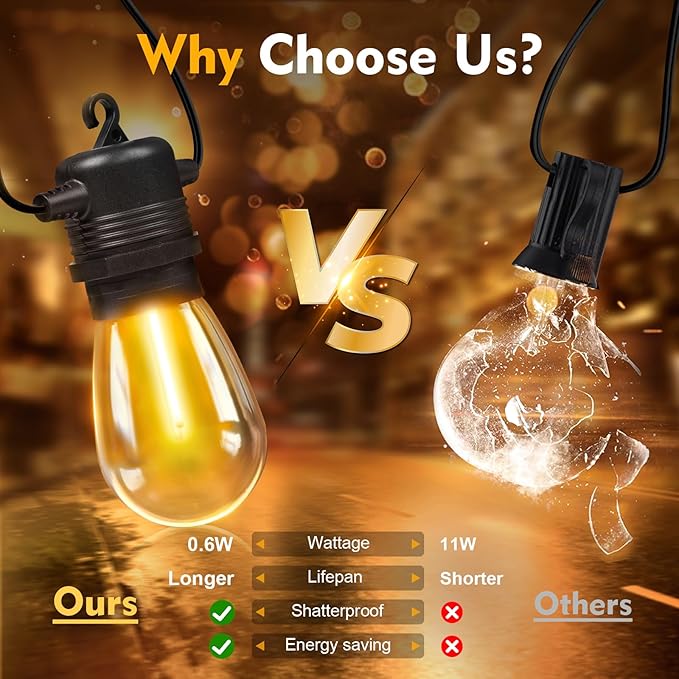 - 【Weatherproof String Lights for Outside】Rain or shine, our S14 string light bulbs shine bright, resilient against rain, wind, and extreme temperatures. Featuring shatterproof bulbs and durable construction, safety is paramount—no more worries about broken glass shards!