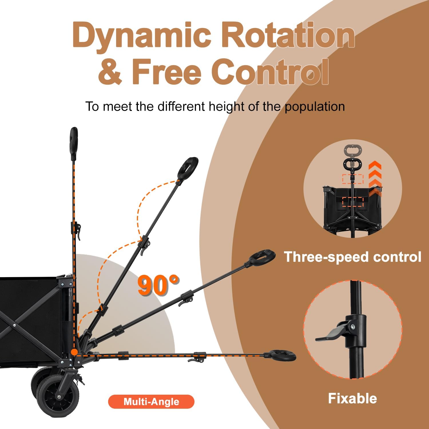 - Folding Wagon Cart-Flexible Maneuverability: The portable wagon is equipped with 360Β°swivel wheels and brakes for stability on slopes, You can go wherever you want to go, no matter how difficult the terrain is. The telescoping handle can be adjusted at any Angle, Accommodates people of different sizes, Even if your child wants to pull it, it's very easy