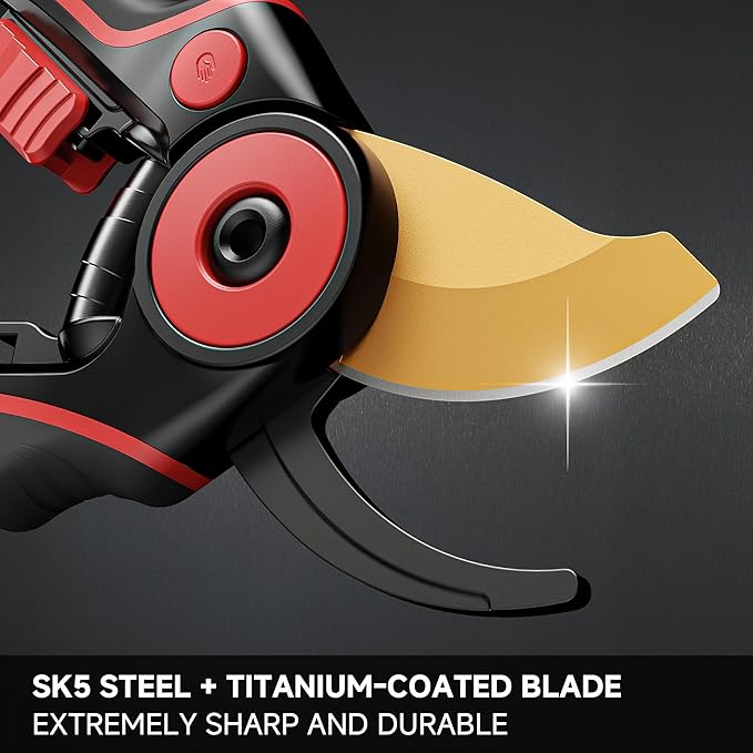 - "🔪 【SK5 High-Carbon Steel + Titanium Plating】Using imported SK5 high-carbon steel forged blades from Japan, the hardness is enhanced to HRC 54 +/- 2 through heat treatment. Combined with the golden titanium coating for rust prevention and wear resistance, it has strong corrosion resistance. These hand pruners maintain sharpness over a long period, ensuring smooth and even cuts for plants, accelerating healing and preventing diseases."