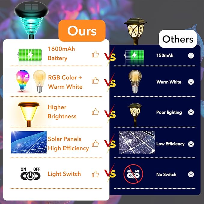 - 【High Efficiency Solar Panel】 Compared with cheap outdoor solar lights, Gedaye is made of imported monocrystalline silicon solar panels and 700mAh rechargeable Ni-MH batteries, it only takes 6 hours to fully charge, which can provide 10-12 hours of illumination with up to 30% solar energy conversion. Using LED beads, brighter and longer life than tungsten lights.