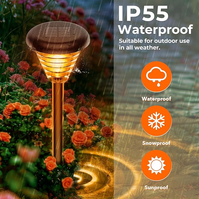 - 【IP55 Waterproof, Easy to Install】No additional wires or power sources are required, Hassle-free installation, and easy portability. Outdoor solar pathway lights are made with premium ABS shell,no yellowing, no rusting, ensuring they can withstand rain, snow, frost or sleet.