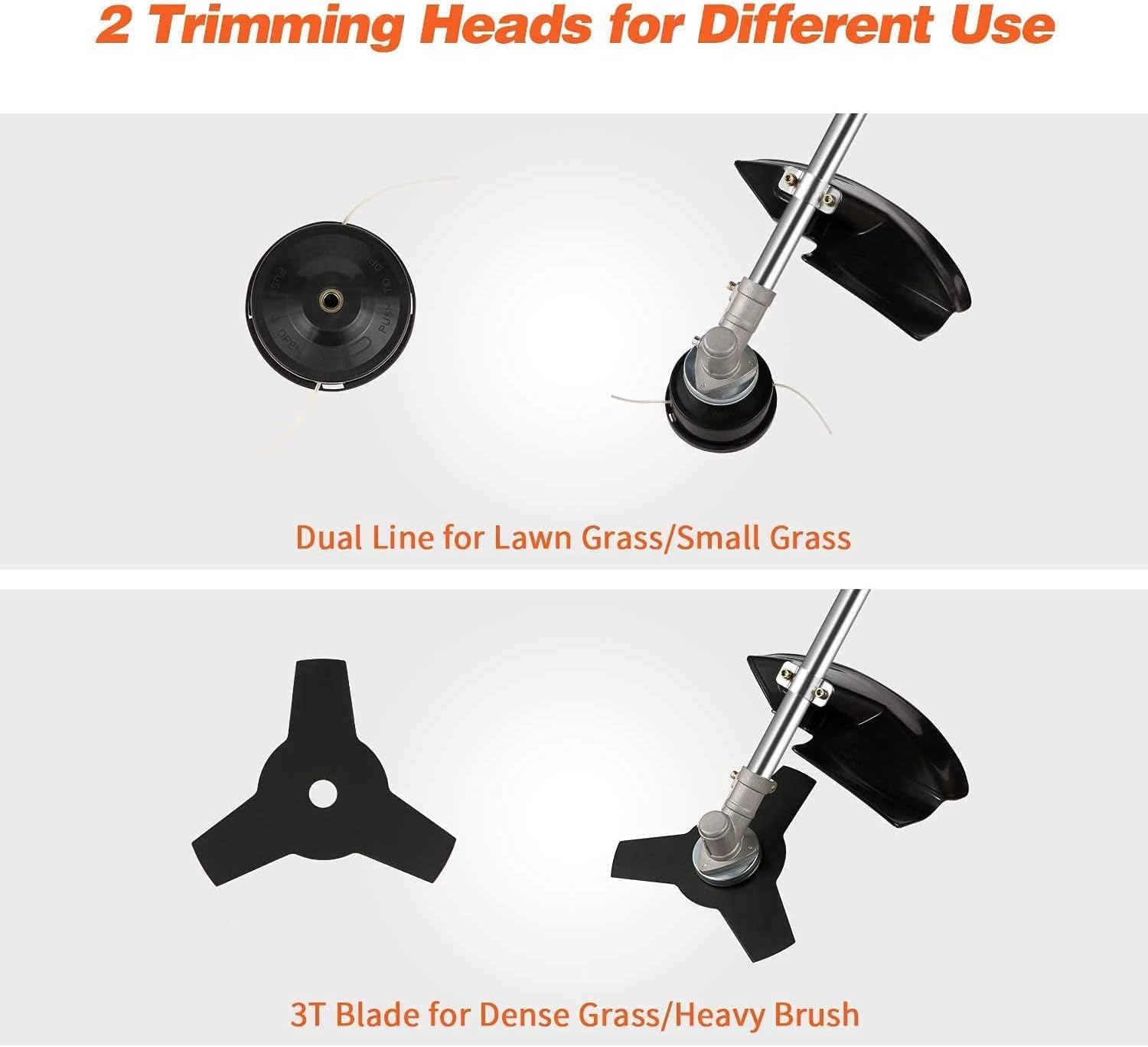 - π2-In-1 Detachable Trimming Heads --- Brush cutter equipped with 2 trimming heads, easily convert from 4T blade to 3T blade or dual thread head. 0.08" dual line head is intended to cut lawn & tender grass; 3T blade/saw blade brush cutter to power through weed and small shrub vegetation or withered grass, ect.