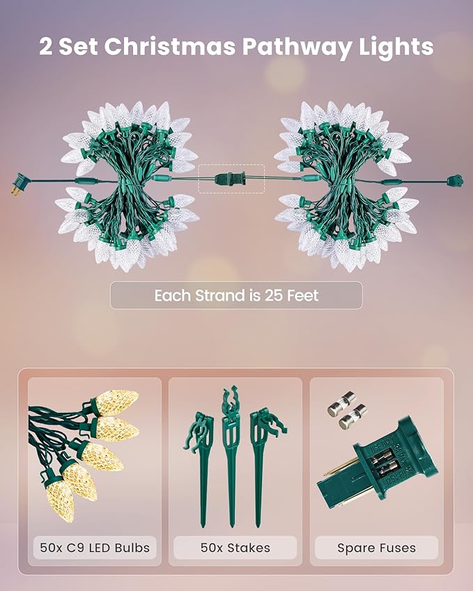 - Warm Festive Decoration: Brighten your outdoor space with the warm glow of 50 LED C9 Christmas Lights. Spanning 50ft(25ft per strand), these charming Christmas path lights create a soft, inviting ambiance for your front door, driveway, and walkway