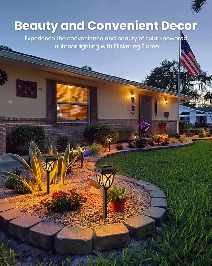 - Flickering Flame Solar Lights: Elevate your garden decor with solar lights outdoor waterproof, boasting a captivating flame effect. Safely illuminate your yard, porch, patio, and garden with a warm, flickering lights