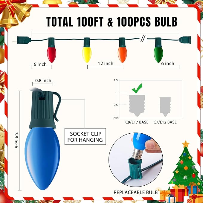 - 100 FT Vintage Outdoor Christmas Lights: 50 feet length with 50 +2 C9 bulbs (2 spare), E17 base light sockets.Multicolor