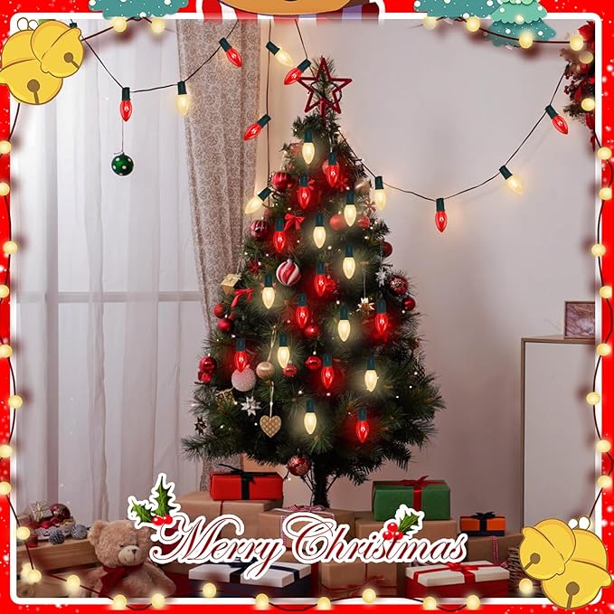 - Bright and Energy-Efficient Holiday Lighting:Transform your home into a winter wonderland with our vibrant red and frosted white Christmas lights. Each bulb operates at 7 watts and 120 volts, providing brilliant illumination while keeping your energy costs in check. The E17/C9 candelabra socket bases ensure easy end-to-end connectivity, allowing you to cover up to 25 feet with minimal effort.