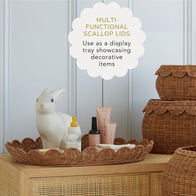 - DISPLAY TRAYS - The Fauna wicker storage basket feature a trendy scalloped design that adds a touch of sophistication. Use the three different-sized basket lids as stylish display trays or ottoman trays, perfect for showcasing decor or organizing items with added functionality