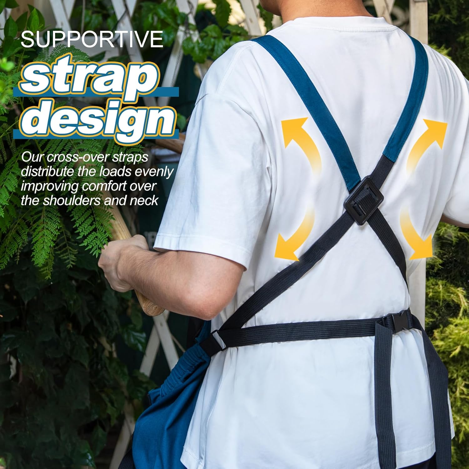 - ADJUSTABLE DESIGN: The belt and long shoulder back straps can be adjusted according to waist size and the durable easy-release buckle makes for a quick adornment. It is a gardening apron that is comfortable to wear, as the weight rests on your hips rather than your neck. This heavy duty work apron is lightweight, can fit both women and men well, it is a practical gift for all gardeners.
