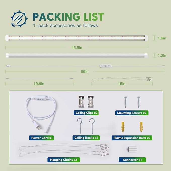 - Easy Installation: Two installation ways—Hanging or Mounting, with included wire rope hooks, clips, connectors, hooks and screws, you could install the plant grow lights indoors by yourself in minutes