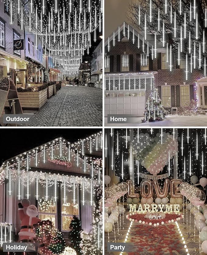 - Easy to Install and Versatile: Our Cascading lights are lightweight and come with hanging holes, making them easy to hang. They can be used as falling rain light, icicle snow fall lights, rain drop string light, and more. The LED lights flash one by one, alternating in cycles, creating a festive atmosphere for Christmas, Halloween, garden, shopping mall, wedding, eaves, yard tree, and more. No matter what scene you want to decorate, these meteor lights will be your ideal choice