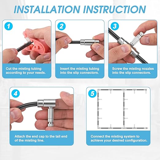 - 【Easy to Install】: The slip lock quick pushing mechanism makes easy installation and disassembly. Just insert the 3/8 inch Nylon PE PU tubing into the straight slip connectors, screw the mister nozzles into the straight slip connectors, and then attach the end cap to the tail end of tubing. During the installation process, the 3 way slip connectors tees can be used to connect tubing from different directions, while the elbow slip connectors can be used to connect different tubing at the corner.