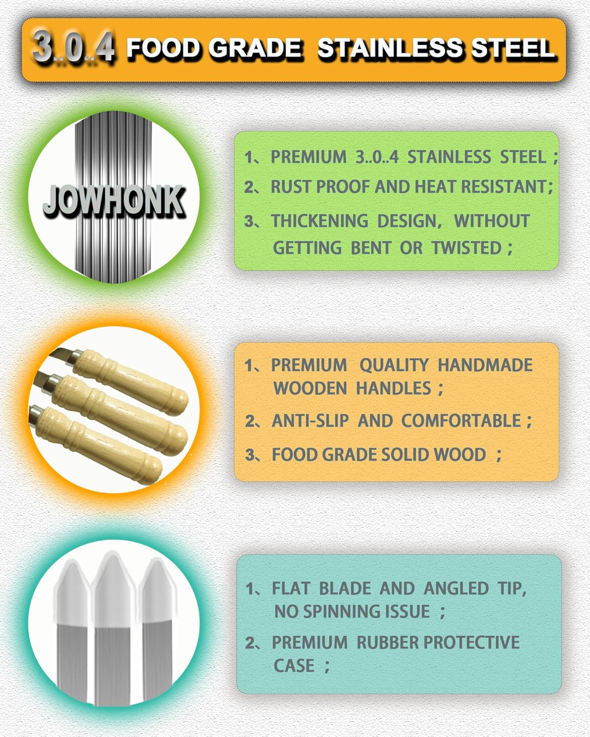 - 【FOOD GRADE 304 STAINLESS STEEL】JOWHONK BBQ 304 stainless steel skewers for grilling are 23.5 inches long,0.4 in width,0.07 in thickness. Our wooden handle flat metal skewers for kabobs are made of premium 304 stainless steel, Ensuring non-rust long time durability, Heat resistant and non-poisonous,Harder than other stainless steel and iron.It's safety for children.Our Premium Stainless steel Barbecue skewers are reusable. The BBQ kabob skewers surface is smooth that grilled food residue won't get stuck onto the kabob skewer blade.