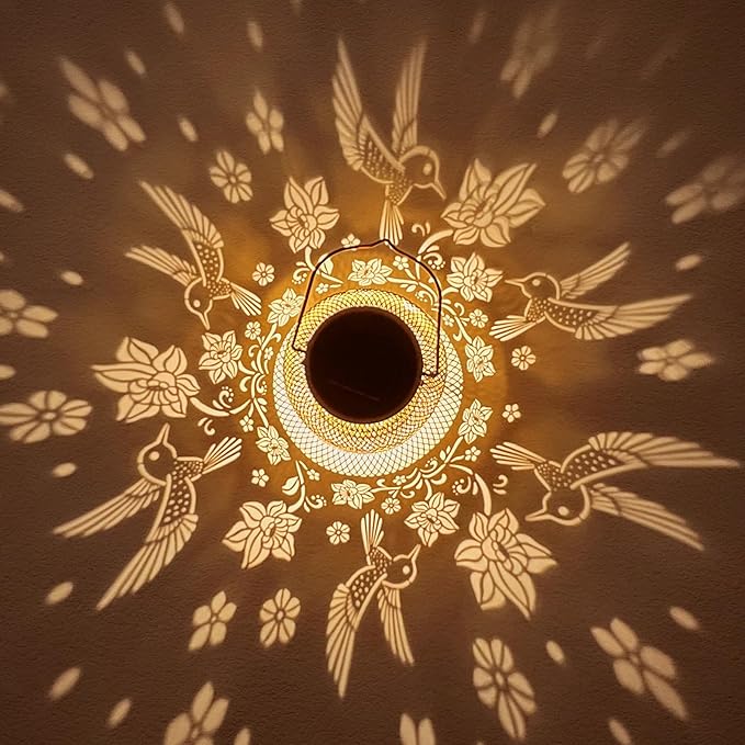 - Graceful Decorative Design - The retro appearance, with gold copper color and hollow out metal veneer, the solar outdoor lanterns casts bright and warm light in darkness, accompanied by gorgeous and graceful hummingbirds patterns, adding a beautiful atmosphere to the surrounding environment.