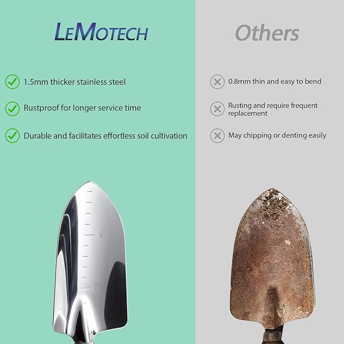- [ Upgrade Garden Tool Set ] Stainless steel garden tools with thickness of 1.5mm provide added strength and durability. Wooden handle smoothly polished and gives a comfortable grip and also protect your hands.