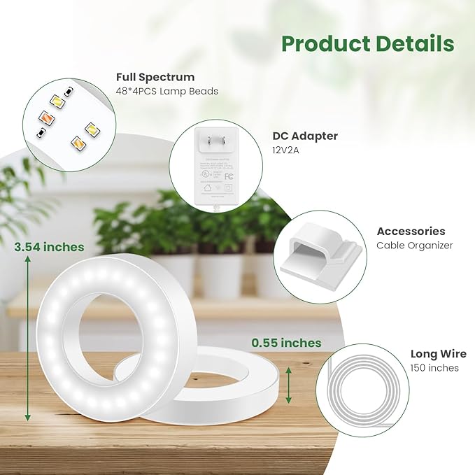 - Unique Design: It is a 4-head plant light, 3.54 inches in diameter and 0.55 inches thick, and has a 150-inch power cord. The small and exquisite design does not take up space and is very suitable for providing light for plants in closed spaces such as cabinets.