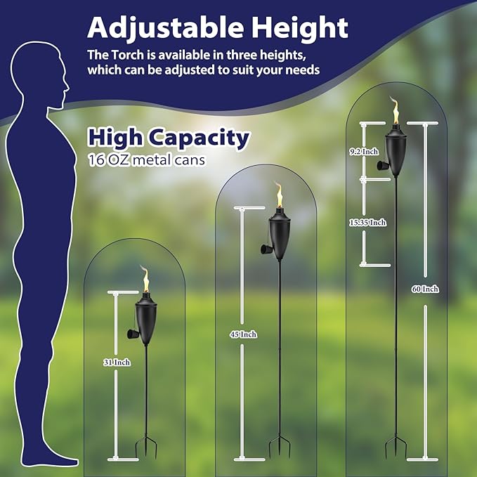 • 【Large Capacity】 Each torches hold approximately 22 oz of fuel, recommended using a funnel when filling torches with oil. Please use snuffer to put out flame and protect the wick after use.