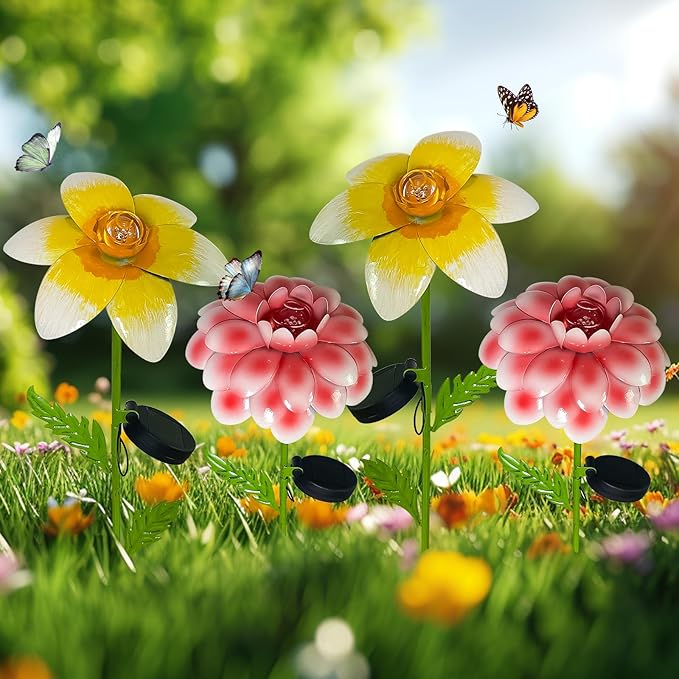 - 🌼【Solar Garden Stakes】4pc solar garden decor can bright up your garden. 3D metal flowers are more lifelike than flat flowers. Whether placed individually or in pairs, our solar powered flowers for outside will add interest to your garden
