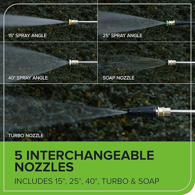 - ACCESSORIES : Equipped with rugged metal gun and hassle-free 25-FT Uberflex kink-resistant hose; 15°, 25° and 40° tips, soap and turbo nozzles included