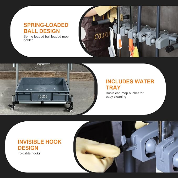 • 3. 【Water Collection Tank】: The bottom of the rack features a water tank designed to collect moisture from wet tools such as mops and cloths. This prevents water from dripping onto the floor, keeping your space clean and dry.