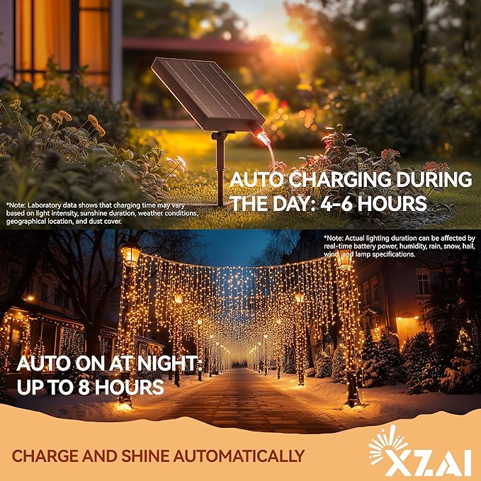 - 8 Lighting Modes with Remote: Set the perfect ambiance with our remote-controlled solar lighting system. With just one click, choose from a variety of lighting effects, from Steady-On to 7 blinking modes, to complement any mood. Use our solar icicle string lights to create your personal outdoor light show for friends and family.