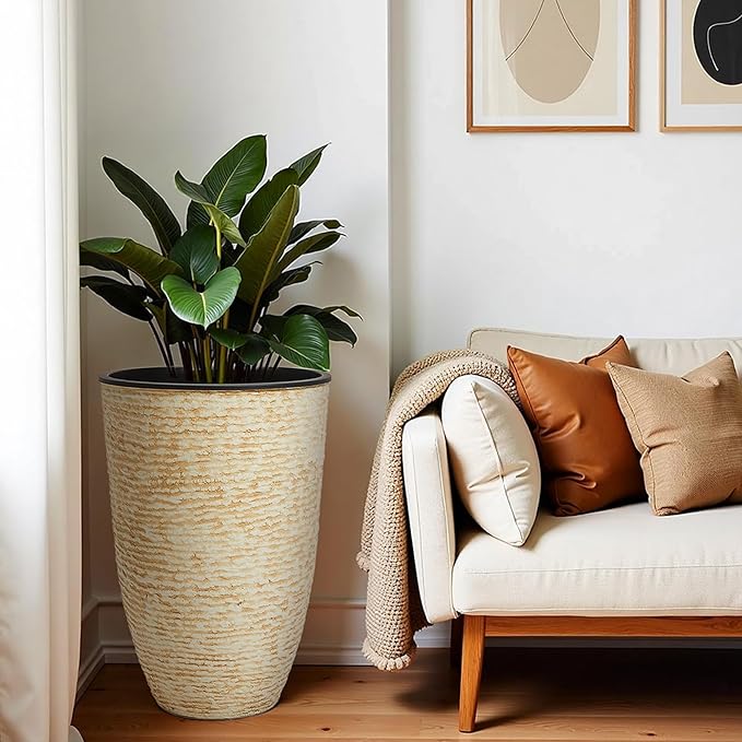 WORTH Garden 2-Pack 21" H. Beige Tall Planters with Inside Pots - 14'' Dia Plastic Large Round Plant Tree Pots - Decorative Imitation Stone Finish for Indoor Outdoor Front Porch Container Patio