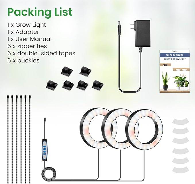 - New Controller: Our halo plant light comes with 5 dimmable from 20 pct to 100 pct, 3 lighting spectrum "White, Warm White and Red, Mixed Light". In particular, we upgraded the timer to 6H, 12H, and 16H, which can easily adjust the light intensity and duration at different growth stages.