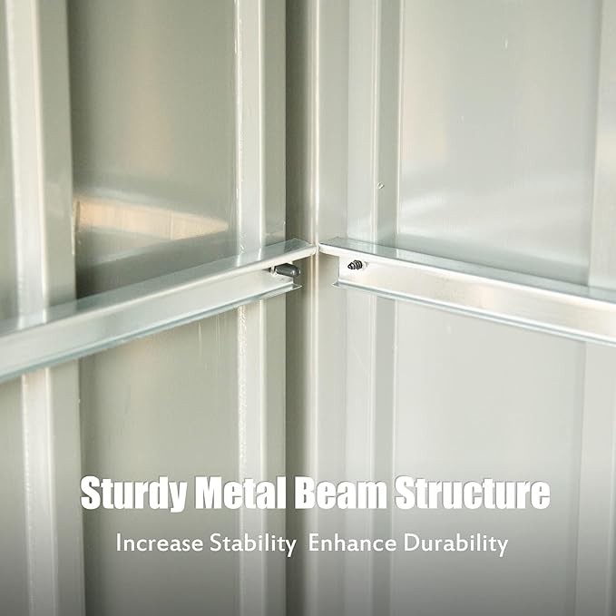 - DURABLE STURDY CONSTRUCTION: This storage shed adopts thicker galvanized steel frame and the sloping roof is supported by sturdy metal beam structure, which are rust proof, waterproof and maintain the ability to resist bad weather for many years, dedicated to outdoor use. The column and the top are thickened to increase the stability and durability.