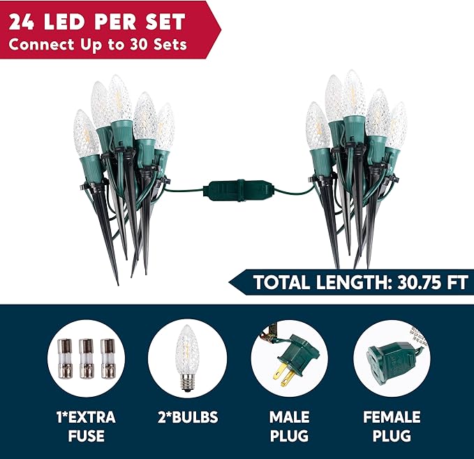 - Ambient Outdoor Lights: 30.75 feet Christmas Strawberry Pathway Stake Lights with 24 LED Walkway Lights Set include 1 Extra Fuse, 2 Spare Bulbs, 1 Male Plug, 1 Female Plug; 15 inch spacing between each C9 Walkway Light bulb, 6 inch tail with female plug and 18 inch head with male connector; Using these Colorful Christmas Yard Lights, which allows 5 colors of red, orange, yellow, green and blue to light up garden, paths, houses, etc., will create an adorable and cozy Christmas festive atmosphere.
