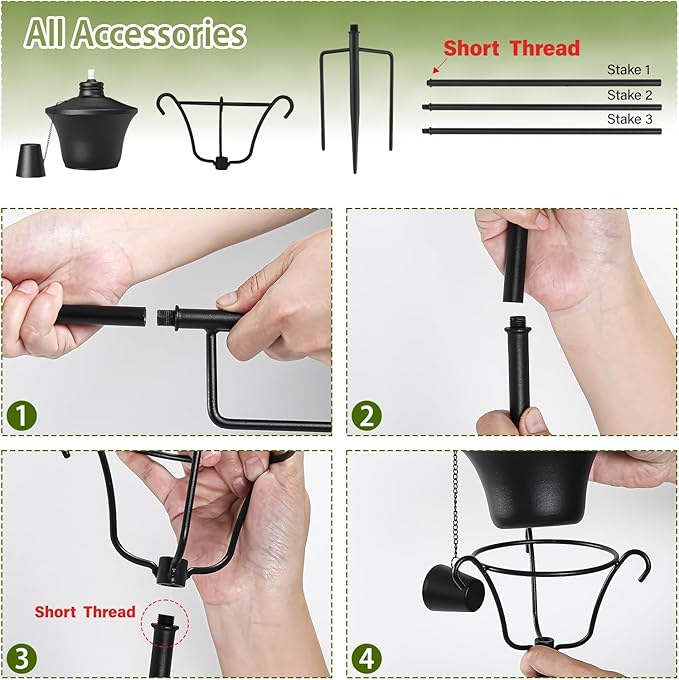• 【Large Capacity】 Each torches hold approximately 16 oz of fuel, recommended using a funnel when filling torches with oil. Please use snuffer to put out flame and protect the wick after use.