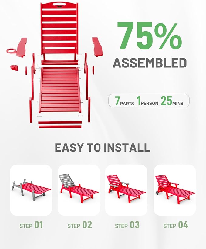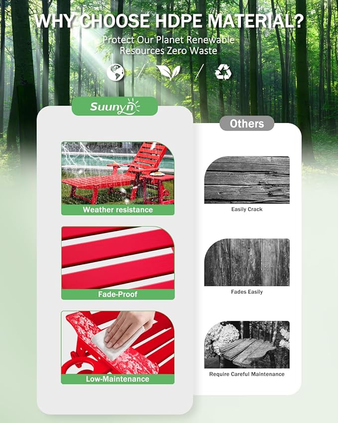 - Premium Suunyn HDPE: The polywood chaise lounge are made from high-density HDPE, which bends slightly under heavy weight or high temperature but returns to its original shape when the weight is removed or the temperature has dropped. This durable material withstands harsh weather and is easy to clean.