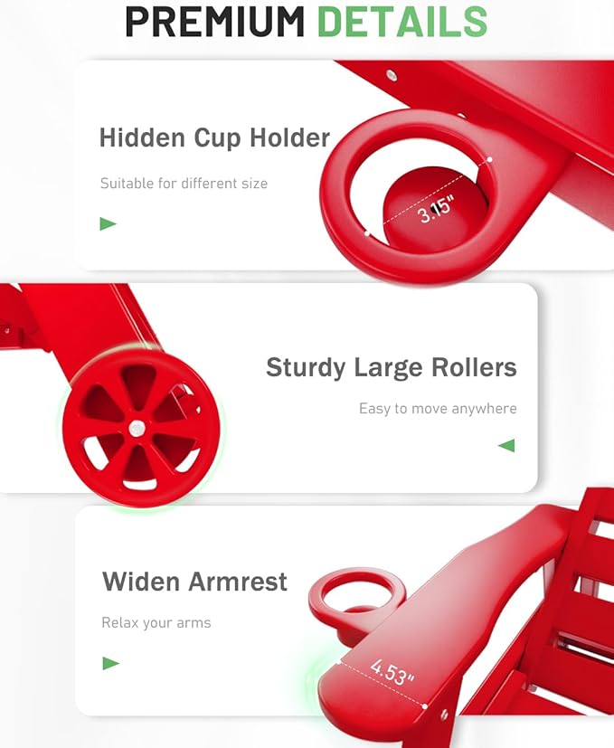 Chaise Lounge Chair Outdoor with Wheels, 6-Position Adjustable HDPE Chaise Lounge Chair with Cup Holder, Outdoor Chair for Pool Poolside Deck Backyard Patio, Red