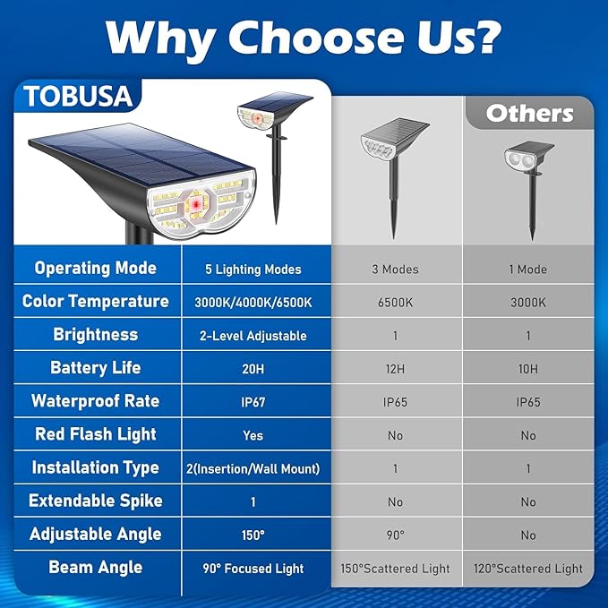 - ใ๐ฎ๐ฌ๐ฎ๐ฐ ๐จ๐ฝ๐ด๐ฟ๐ฎ๐ฑ๐ฒ๐ฑ ๐ฅ๐ฒ๐ฑ ๐๐ป๐ฑ๐ถ๐ฐ๐ฎ๐๐ผ๐ฟ ๐๐ถ๐ด๐ต๐ใ Driven by customer-oriented values, TOBUSA kindly set aside an indicator light at the middle for each led solar landscape spotlights. The light keeps flashing in red when the solar spot lights are under charging and auto off after charging completed. This smart design provides necessary convenience for our customer to track on the status of the solar battery