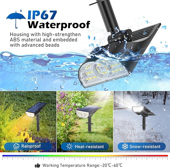 - ใ๐ฆ๐๐๐ฟ๐ฑ๐ ๐ฆ๐ผ๐น๐ฎ๐ฟ ๐๐ถ๐ด๐ต๐๐ ๐ณ๐ผ๐ฟ ๐ข๐๐๐ฑ๐ผ๐ผ๐ฟ&๐๐ฃ๐ฒ๐ณ ๐ช๐ฎ๐๐ฒ๐ฟ๐ฝ๐ฟ๐ผ๐ผ๐ณใ Housing with sturdy ABS material and covered by tightly sealed clear lens, our solar powered garden lights withstand all kinds of extreme weathers like heavy rain, intense heat, severe cold, frog or frost. Working temperature ranges from -20โ-60โ. Coupled with IP67 waterproof high rating, our outdoor solar spotlights are able to secure your outside garden pathway patio landscape all year round with bright lighting ambience, no delay or flicker