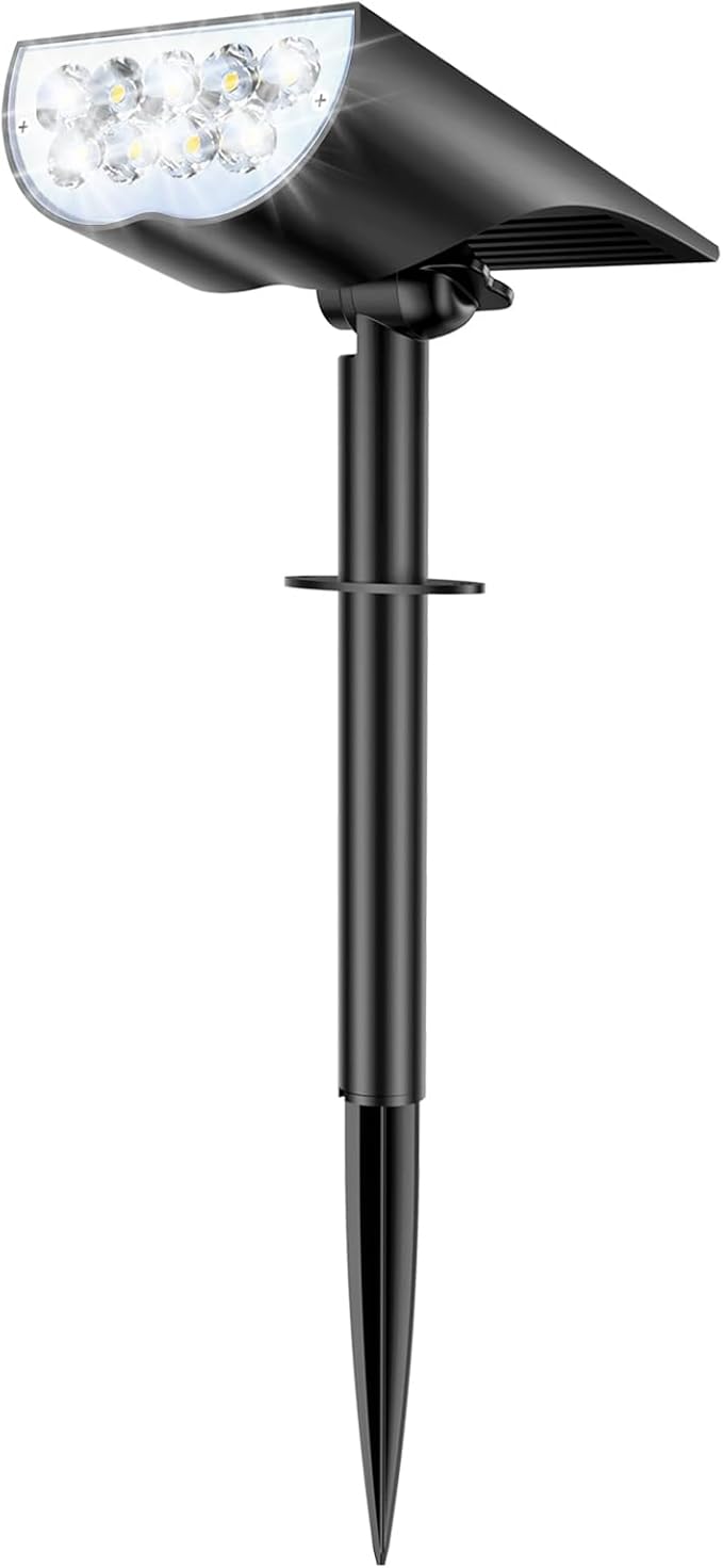 - Solar Powered & Auto On/Off:Featuring large area solar panel,our solar garden light can easily capture the sunlight and store the energy with a charging conversion rate of 19.6%. 120° adjustable light head help you precise illuminate wherever you need. Built-in light sensor can detect brightness change, so the outdoor spot lights can automatically turn off at dawn and then light up your home every evening