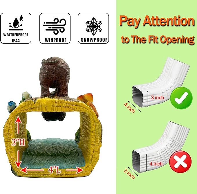 - Pay Attention The Fit Opening of Downspout Extender Decor: The vivid animal decor gutter downspout is fitting rectangular downspout opening up to 3"in Hx 4"in L.Simply connect the downspout,the extension splash block will fit your garden downspout tightly and perform nicely.