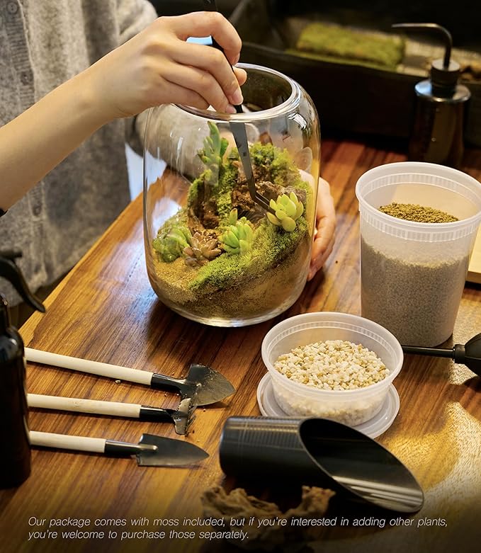 • Included Components : terrarium jar, potting soil, garden gravel, clear sand, live moss, plant mat, 2 shovels, rake, spray bottle, scoop, stainless steel tweezers, brush, 4 pieces of driftwood, 6 landscape stones, 2 decorative ornaments, grow light terrarium jar, potting soil, garden gravel, clear sand, live moss, plant mat, 2 shovels, rake, spray bottle, scoop, stainless steel tweezers, brush, 4… See more
