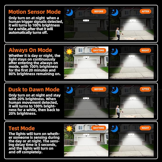 - 【4-IN-1 SMART LIGHTING CONTROL】: Choose from Always-On, Dusk to Dawn Outdoor Lighting, Motion-Activated (6-12m range), or Custom Timer modes. The Intelligent Motion Sensing Design automatically extends lighting during continuous movement, while the photocell mode ensures lights only activate in darkness – ideal for Garage Motion Sensor Lighting and Yard Security Flood Lights.