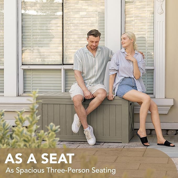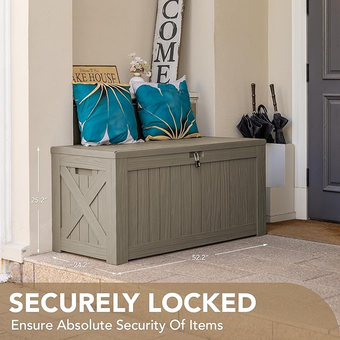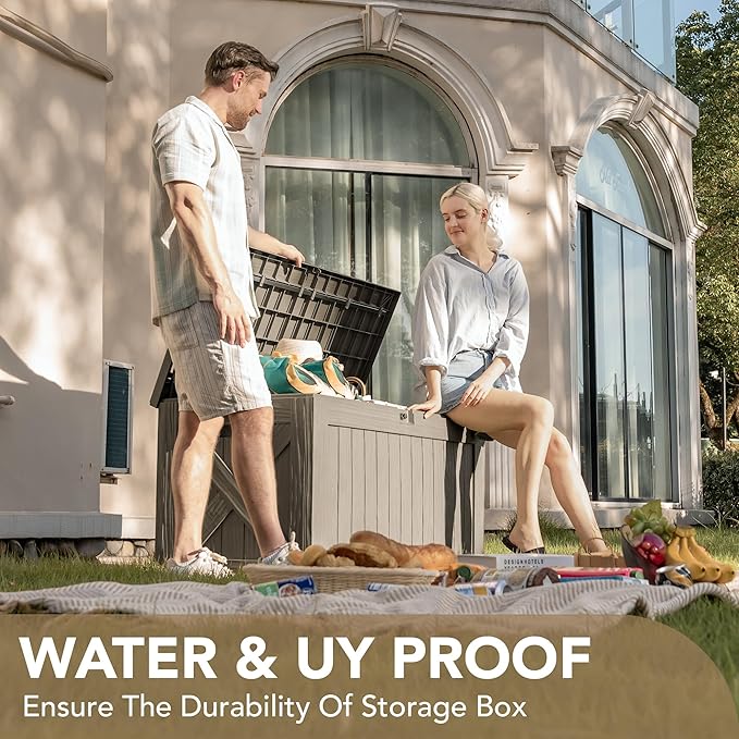 • High-quality Resin: The deck storage box is made of water-resistant resin, complemented by a wood like grain design that maintains a fresh look even with all-weather use