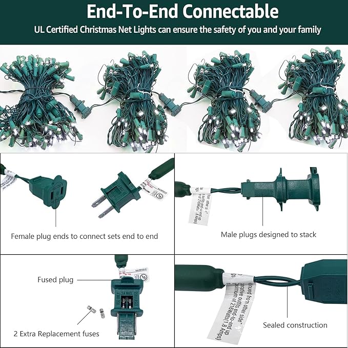 - 【UL Certified Net Christmas Lights】: Our outdoor christmas net lights Strictly tested and meets the US requirements of string lights UL safety standards.Not only christmas net lights has passed the UL certification as a whole, but its raw materials and accessories (such as wires and plugs) are all UL-certified products. High quality certified products ensure the safety of you and your family. Won't over heat even used for a long time.It has approved for indoor and outdoor christmas decorations.