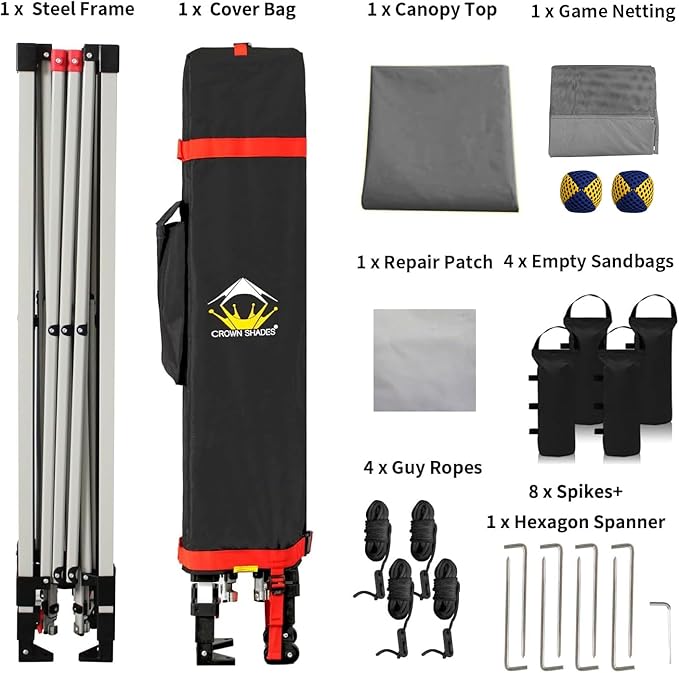 - HIGH GRADE STEEL FRAME - The durable, high-grade, corrosion-resistant steel truss frame with hardened through bolts comes pre-assembled and can be set up without any tools. Engineered to support up to 120 lbs. distributed across the frame, it ensures robust and reliable performance. The extended ceiling assembly and upgraded high peak design make it easier for rainwater to run off, preventing water pooling on the canopy. Perfect for extended outdoor use at markets, festivals, and exhibitions