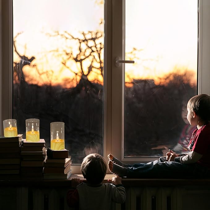 Battery Operated Candles with 6H Timer, 3 Pack Glass LED Flikcering Flameless Candles, Clear Pillar Candles with 3D Flame for Spring Wedding Home Bedroom Decor(Set of 3)
