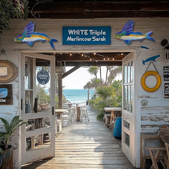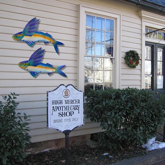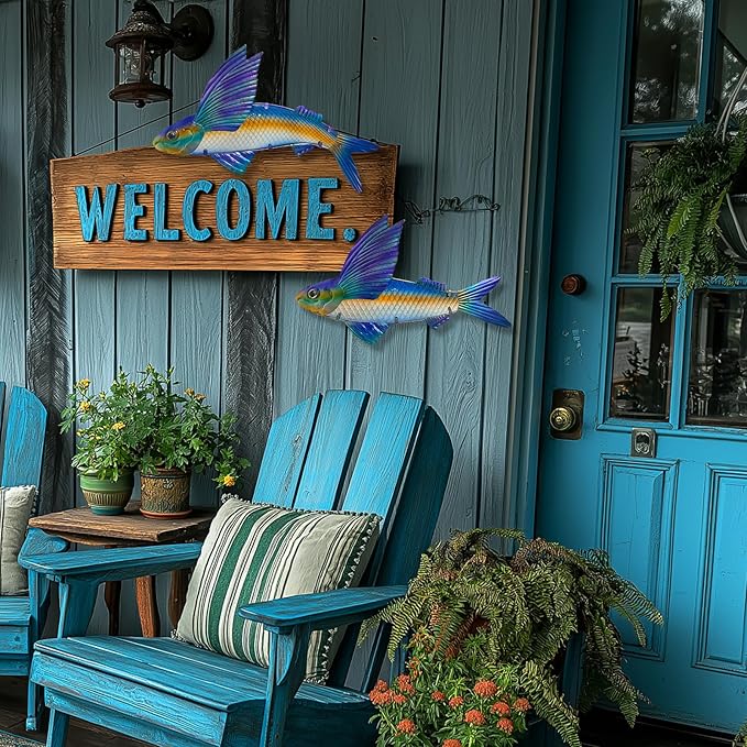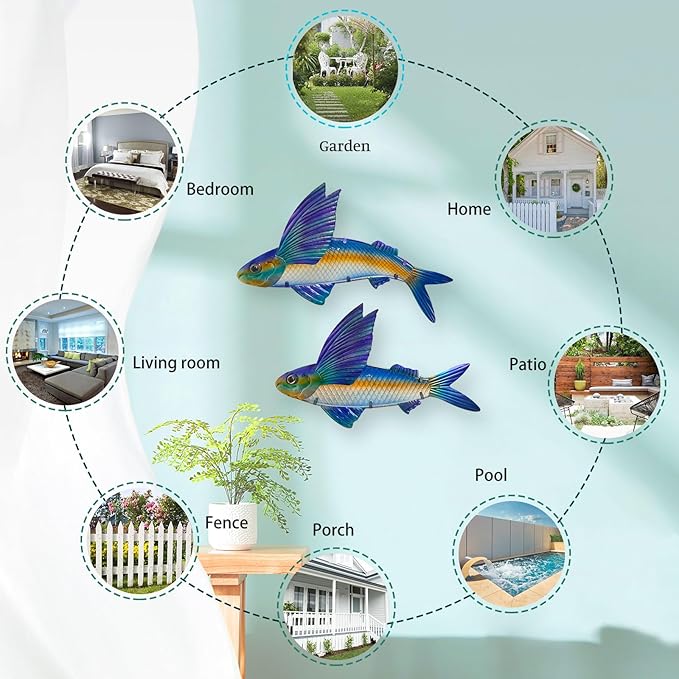 - ✨【𝑫𝒊𝒇𝒇𝒆𝒓𝒆𝒏𝒕 𝑼𝒑𝒈𝒓𝒂𝒅𝒆】:You will get included 2 pieces of flying fish decoration - Measure 15 inches. The vivid metal fish wall decor matches are perfect for any decor style and can be displayed in the bedroom, living room, office, study, baby room, kitchen, yard, porch, patio, garden, and more