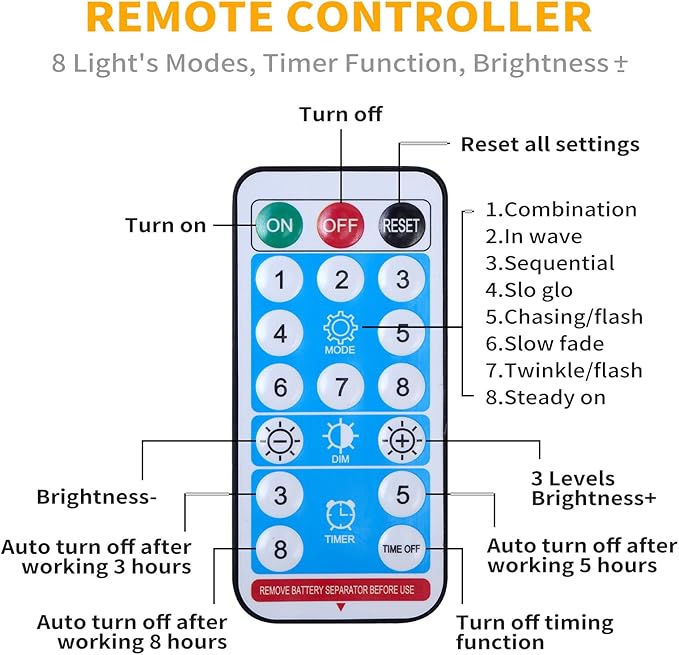 - 8 LIGHTING MODES: Combination, in wave, sequential, slo glo, chasing/flash, slow fade, twinkle/flash, and steady on. Different light's modes bring you different good mood.