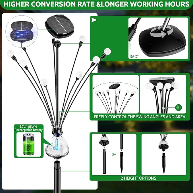- Unique design: Our solar garden lights have 9 larger and brighter LED premium firefly bulbs, besides the 9 firefly bulbs, there is an illuminating LED light at the bottom which is composed with 6 LED bulbs with warm white lighting to illuminate the pathway. The solar panel is on the top of the lights, which can be rotated in 360Β° and adjustable to aim at the sky for maximum sunlight absorption.
