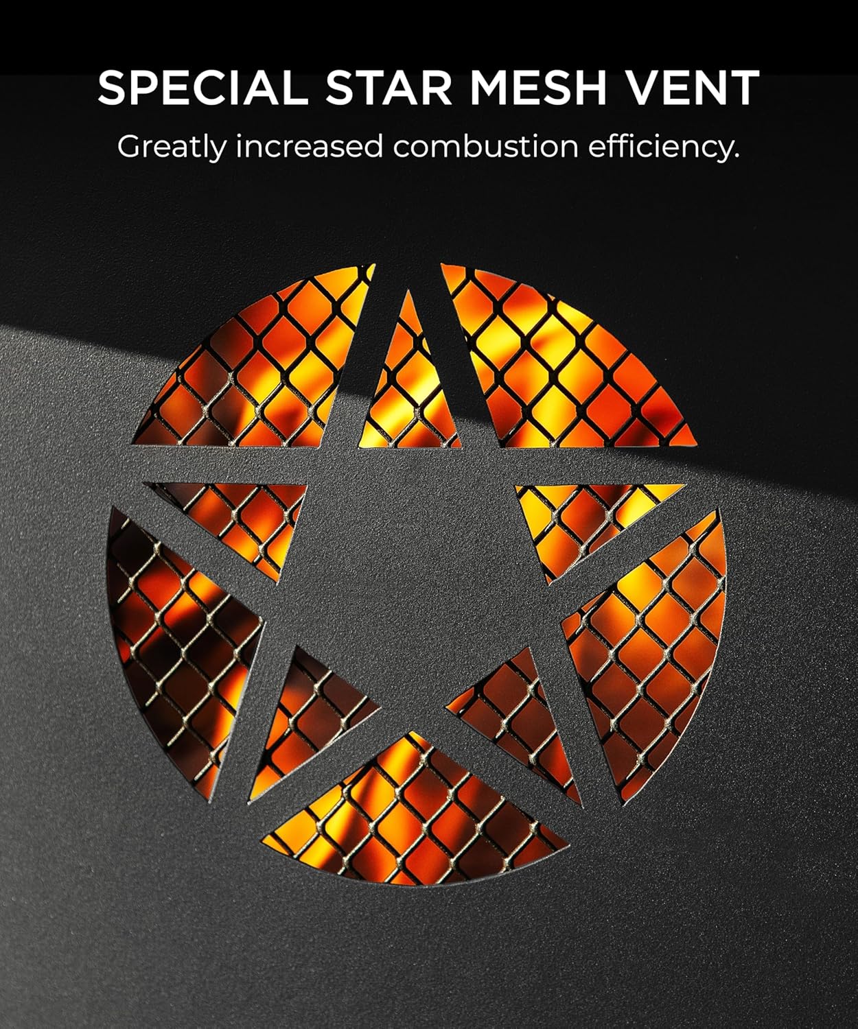 - 【MODERN & HUMANIZED DESIGN】The fire pit table comes with 1 height-adjustable 360° swivel grills which disassemble freely. You can barbecue, keep food warm or put pan to cook on them. The side of wood-burning fire pit is created with charming pentagram cut-out design which catches firelight for creating fun shadows. The drilled design promotes airflow and keeps the fire strong.