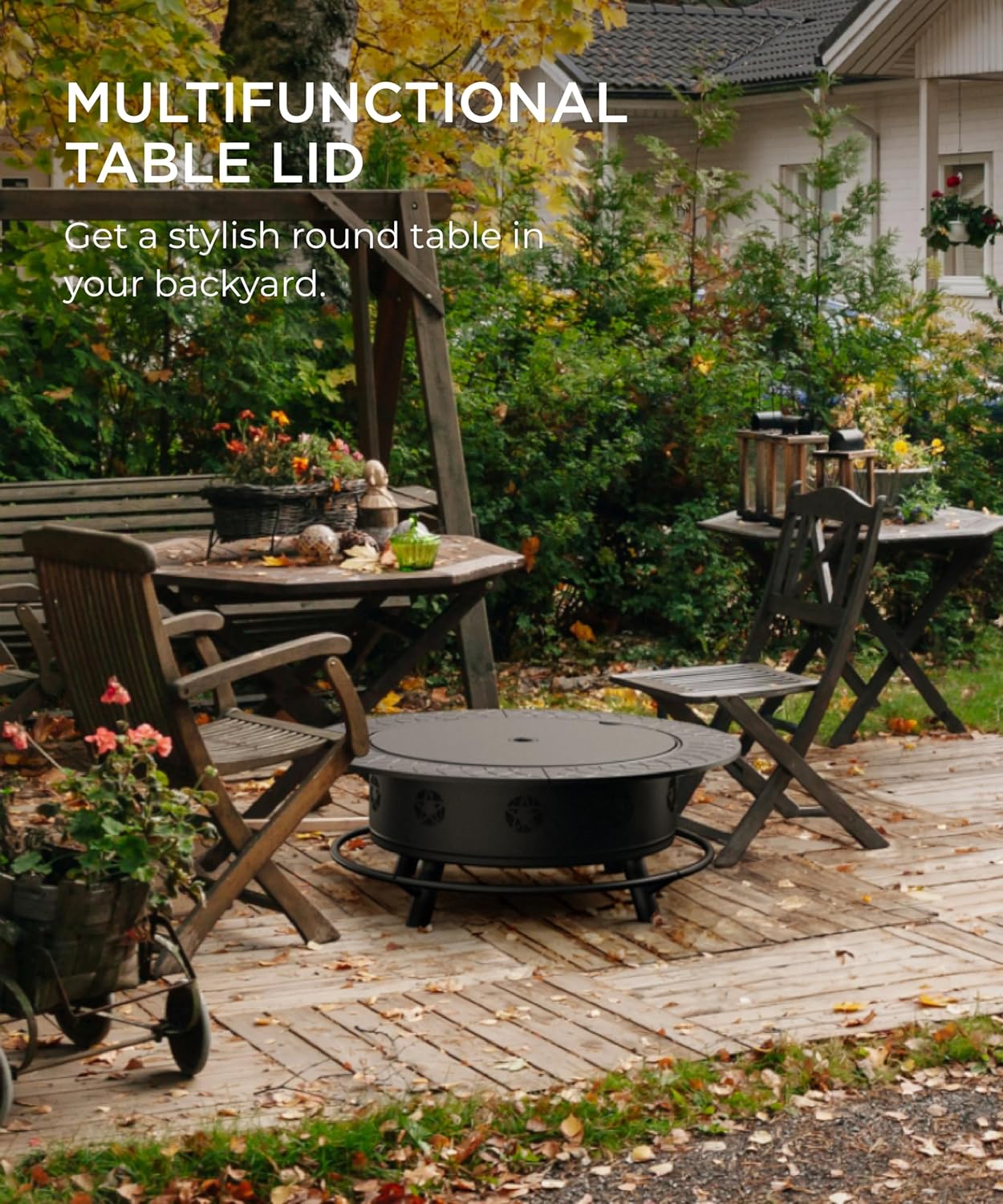 - 【PERFECT GIFT FOR YOUR LOVED ONE】The fireplace is perfect for gathering of 12–15 people and is an ideal size for your yard, you can move it around to wherever you want to enjoy a comfortable fire. 3 in 1 fire pit is great for keeping warm in any season, hosting bonfires, or throwing a cooking party. The fire pits table make a fantastic addition to your outdoor decor, adding both style and functionality to your outdoor space.