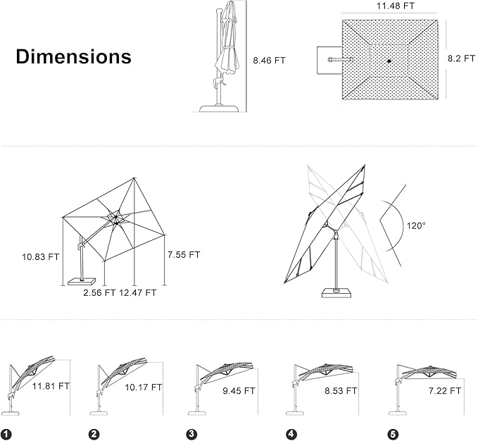 - Upgraded Swivel Function: The umbrella rotates 360°, the canopy tilts left and right, and has 5 adjustable positions to provide optimal shade from all angles, allowing you to enjoy a comfortable outdoor experience all day long.